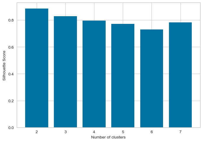 The optimal number of clusters is usually the one with the highest Silhouette Score. Therefore, in this case, we would look for the highest bar on the graph to determine the optimal number of clusters. Therefore, the following graph shows silhouette score is high for k=2,4,7Elbow method and silhouette methode to analyse the number of clusters to show