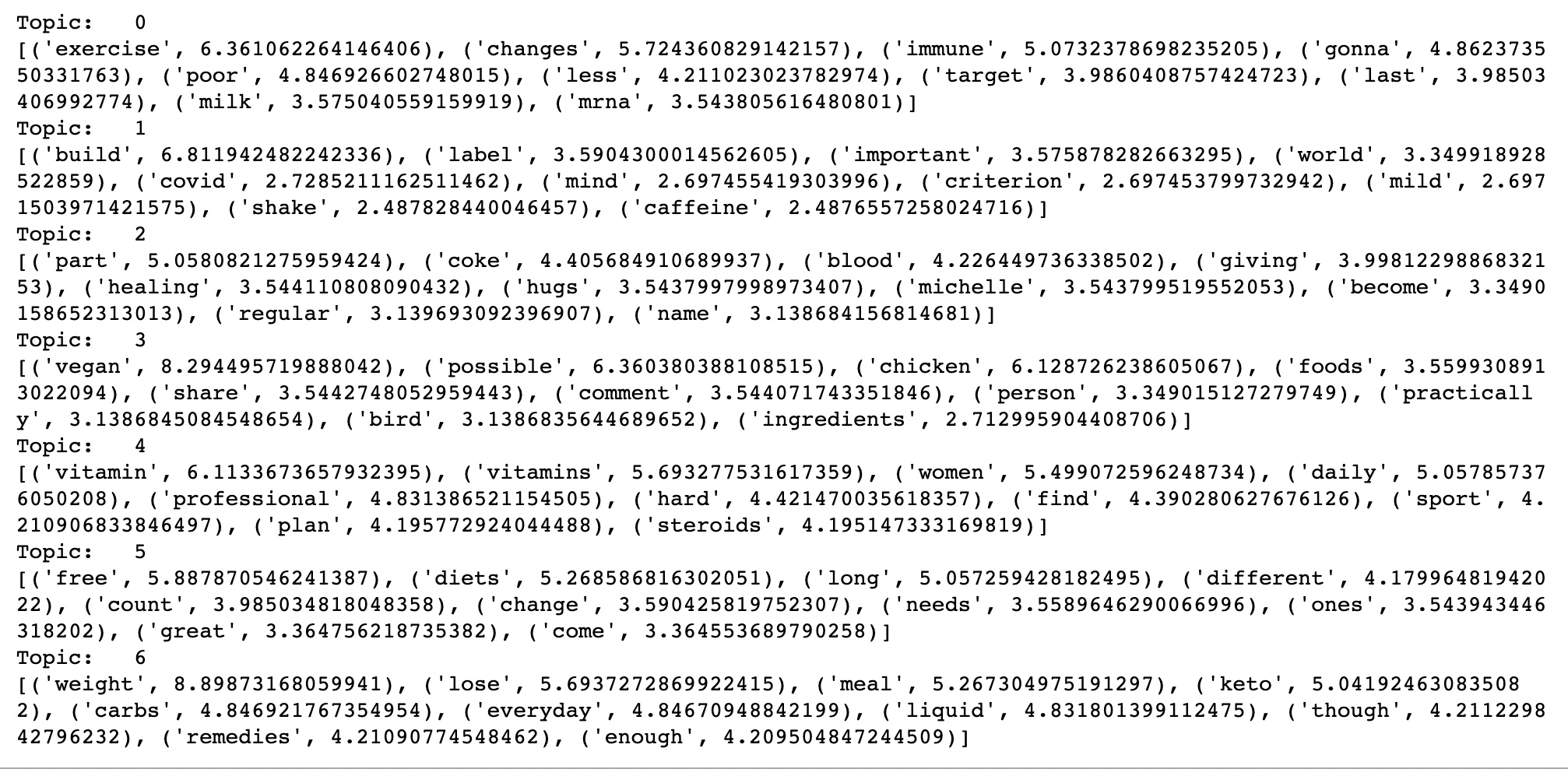 Latent Dirichlet Allocation (LDA) is a probabilistic topic modeling technique that can be used to identify hidden topics or themes in a large corpus of text data. It assumes that each document in the corpus is a mixture of several topics, and that each topic is a probability distribution over a set of words. In the context of Twitter data related to supplement intake, we can apply LDA to identify the underlying topics or themes that are discussed in the tweets. We can use LDA to identify the most important words or phrases that are associated with each topic, as well as the distribution of topics across the tweets in the dataset.