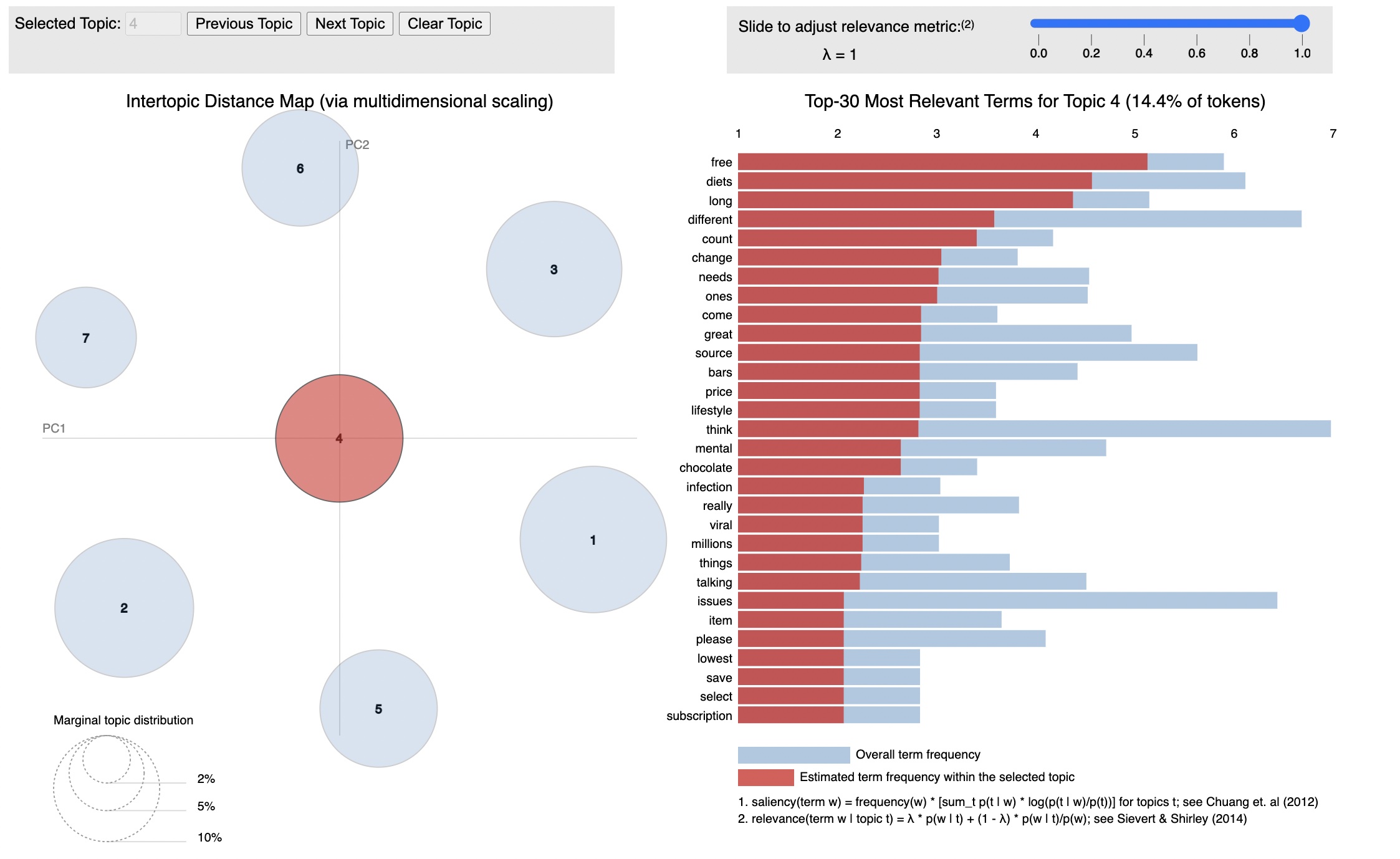 The Intertopic Distance Map (via multidimensional scaling) is a visualization tool used to display the relationships between topics in a topic model. Each point on the map represents a topic, and the distance between the points reflects the similarity or dissimilarity between the topics.