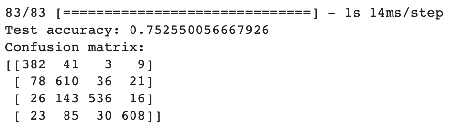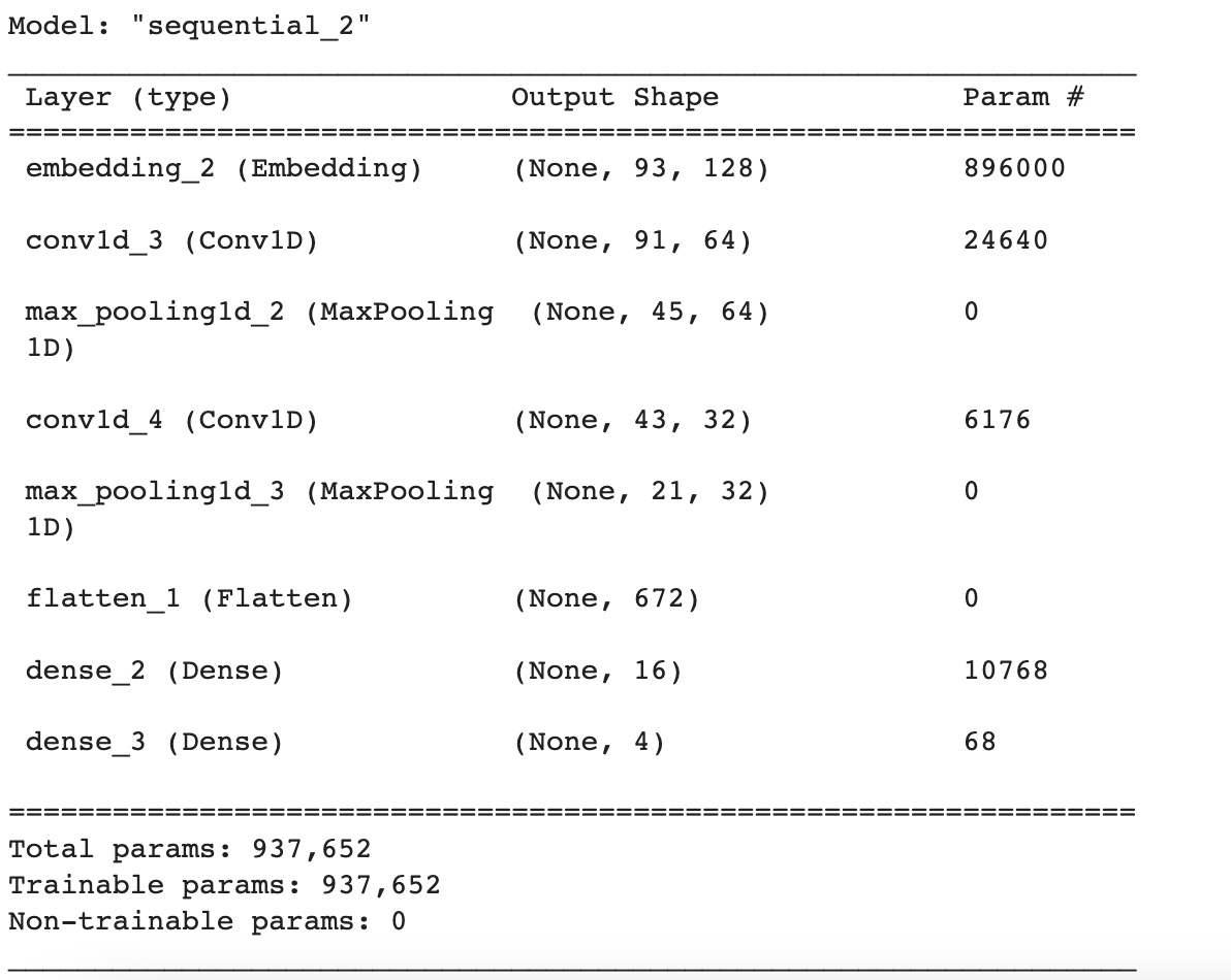 This is a Keras Sequential model with six layers: An Embedding layer with 896,000 trainable parameters, which maps integer word indices to dense vectors of size 128. A 1D Convolutional layer (Conv1D) with 24,640 trainable parameters, which applies 64 filters of size 3 to the input sequence. A MaxPooling1D layer (MaxPooling1D) with no trainable parameters, which downsamples the output of the previous layer by taking the maximum value over a window of size 2. Another Conv1D layer with 6,176 trainable parameters, which applies 32 filters of size 3 to the output of the previous layer. Another MaxPooling1D layer with no trainable parameters, which downsamples the output of the previous layer. A Flatten layer, which flattens the output of the previous layer into a 1D tensor. A Dense layer with 10,768 trainable parameters and ReLU activation, which computes a linear transformation of the input followed by a rectified linear activation function. A final Dense layer with 68 trainable parameters and softmax activation, which computes a linear transformation of the input followed by a softmax activation function that outputs a probability distribution over the four possible classes. The model has a total of 937,652 parameters, all of which are trainable. The first layer (Embedding) has the most parameters, followed by the first Conv1D layer.
