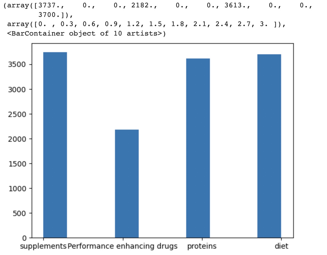 The number 382 in the first row and first column means that 382 instances were correctly classified as protein, while 41 instances that actually belonged to the protein class were incorrectly classified as diet, 3 instances as drugs, and 9 instances as supplements. The diagonal elements of the matrix represent the instances that were correctly classified, while the off-diagonal elements represent the instances that were misclassified. The overall accuracy of the model can be calculated as the sum of the diagonal elements divided by the total number of instances. In this example, the model achieved an overall accuracy of 75%