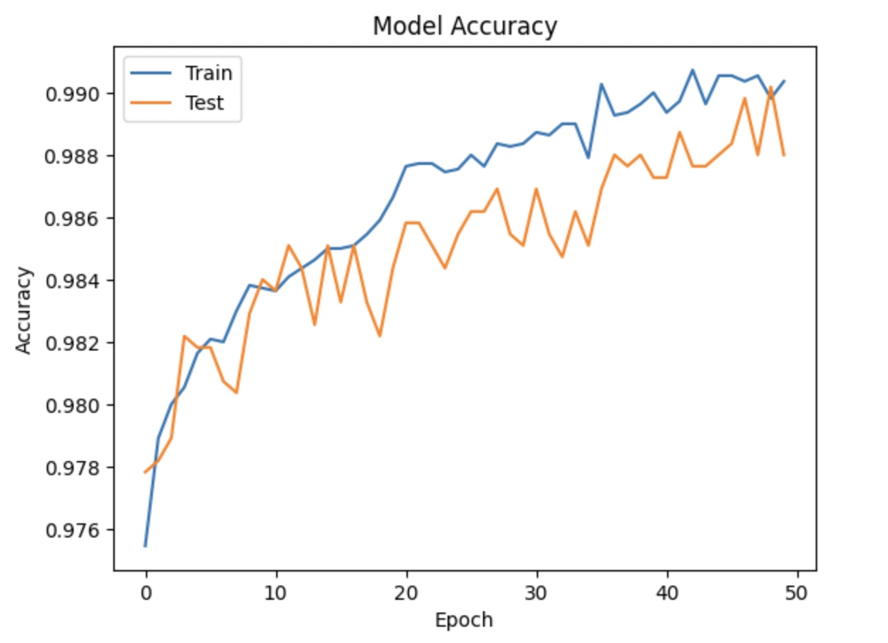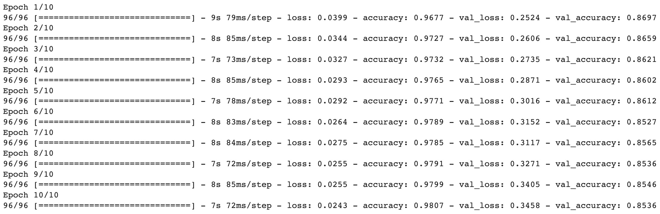 This is the output of a neural network model during training. The model is trained for 50 epochs, and this output shows the loss and accuracy metrics at each epoch. In each epoch, the model is fed with training data, which is used to update the weights of the model. The loss metric measures how well the model is predicting the output compared to the actual output. The accuracy metric measures the percentage of correct predictions made by the model. In the output shown, we can see that the loss value is decreasing and the accuracy value is increasing over the epochs. This is a good sign as it indicates that the model is improving in its predictions. By the end of the training, we can expect the loss value to be minimized and the accuracy value to be maximized.